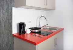 - equipped kitchen with cooking utensils, sink, stove, fridge